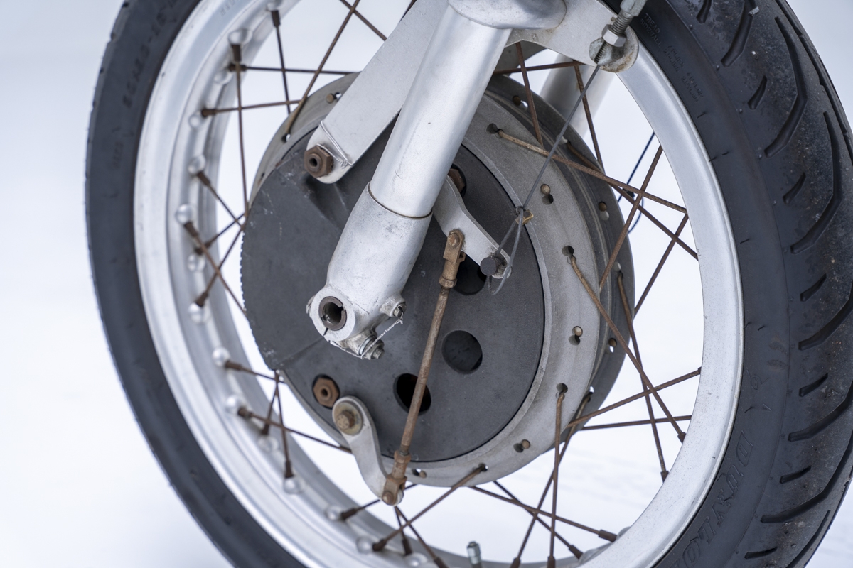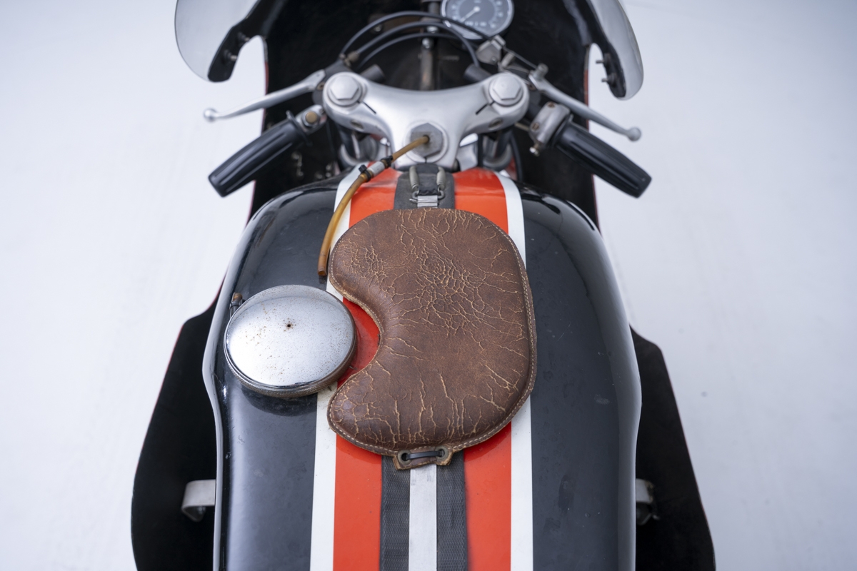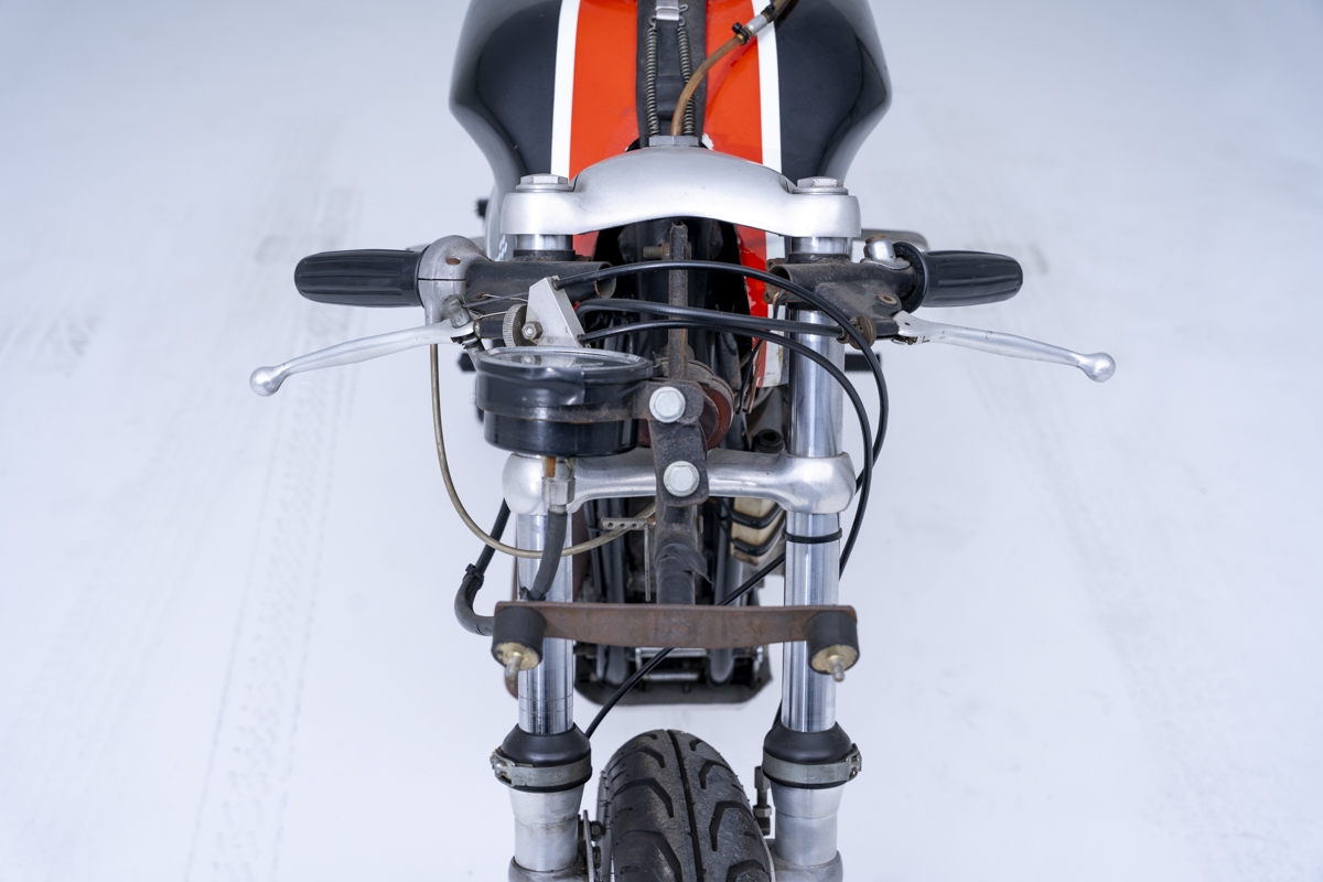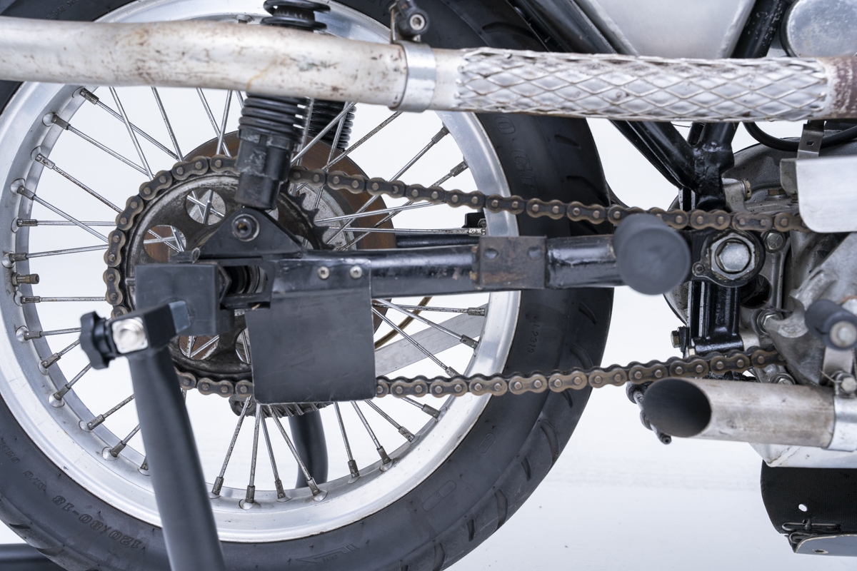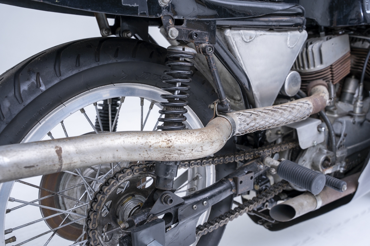 特筆すべきは、当時のレースシーンを物語る珠玉のパーツ群だ。イタリア製のCerianiフロントフォークをはじめ、前後のBorrani RECORDリム、Hurst Airheartの刻印が刻まれたリアブレーキ、そしてSmiths製クロノメトリック・タコメーターなど、一級品の装備が惜しげもなく組み込まれている。さらに、Linkert MR-4キャブレターとFairbanks-Morseマグネトーが備わり、三角形のアルミオイルタンクやダイヤモンドヒートガード付きのストレートパイプマフラーが、レーサーとしての凄みを強調する。