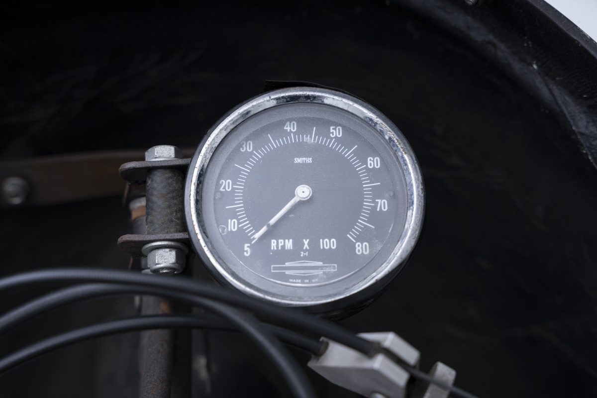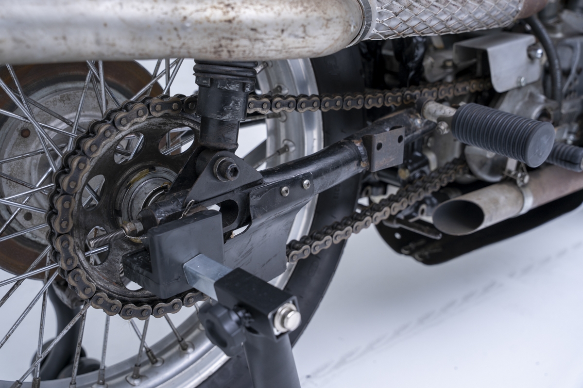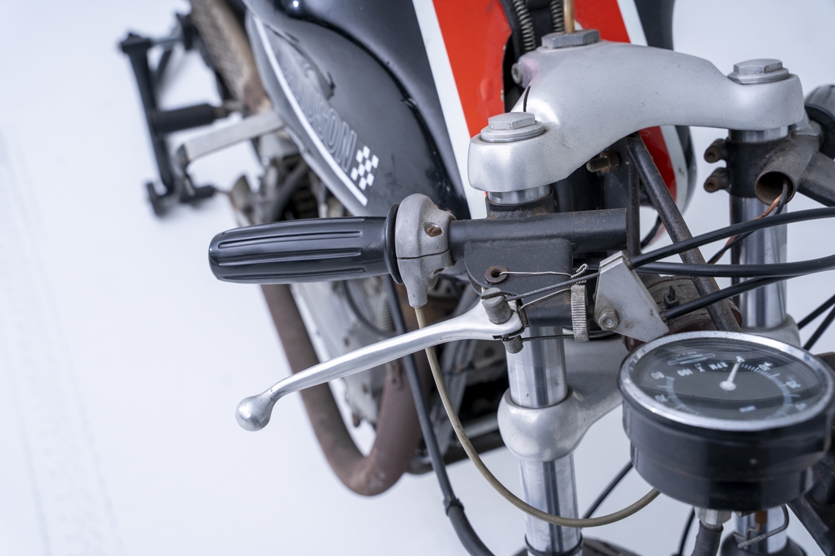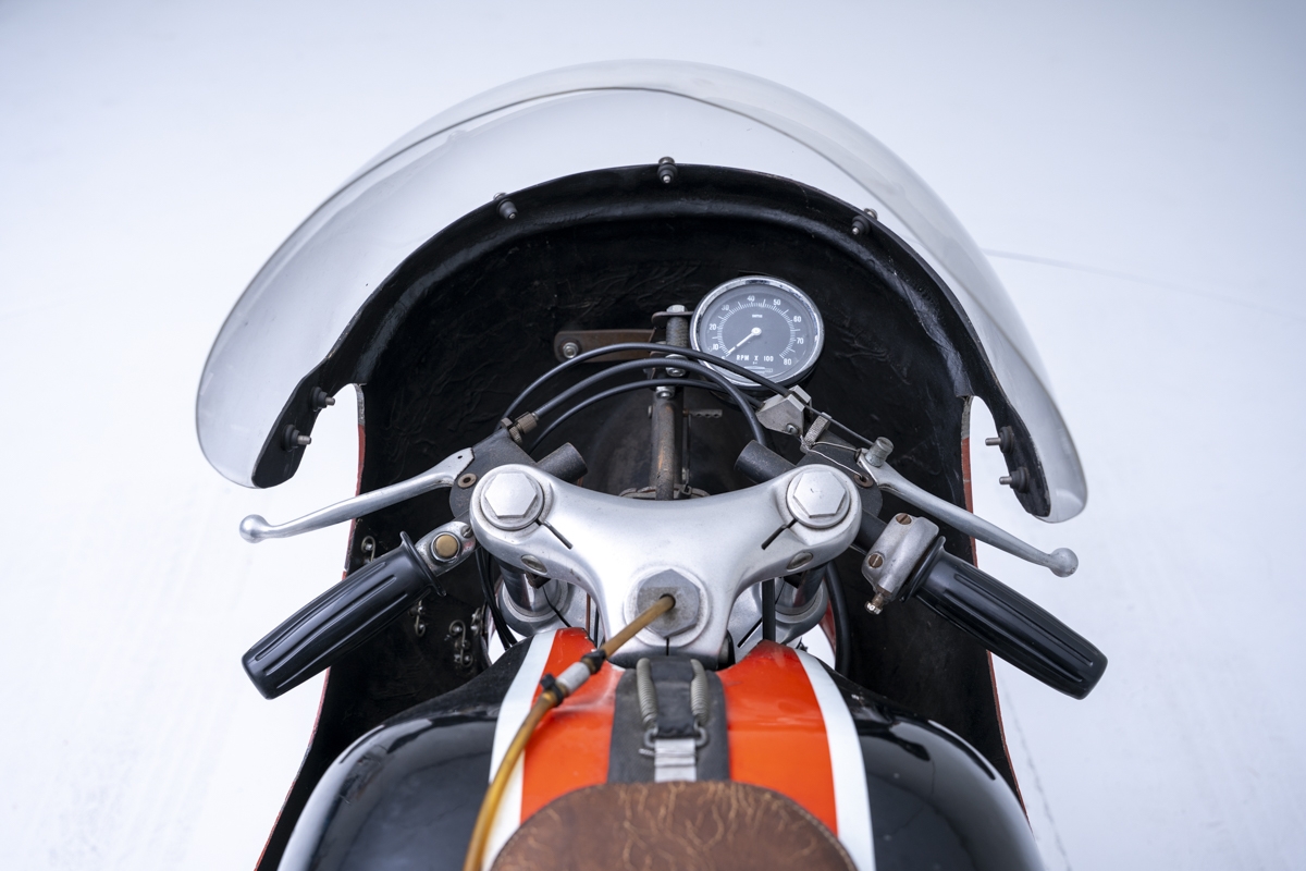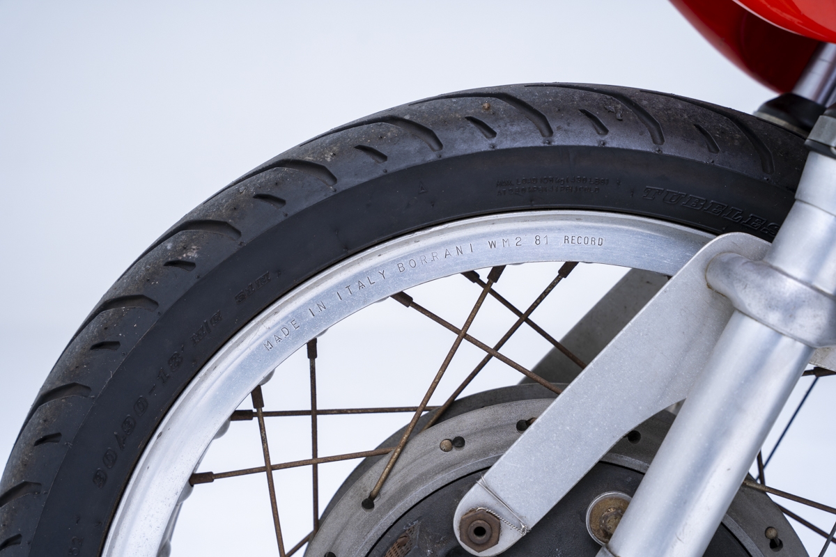特筆すべきは、当時のレースシーンを物語る珠玉のパーツ群だ。イタリア製のCerianiフロントフォークをはじめ、前後のBorrani RECORDリム、Hurst Airheartの刻印が刻まれたリアブレーキ、そしてSmiths製クロノメトリック・タコメーターなど、一級品の装備が惜しげもなく組み込まれている。さらに、Linkert MR-4キャブレターとFairbanks-Morseマグネトーが備わり、三角形のアルミオイルタンクやダイヤモンドヒートガード付きのストレートパイプマフラーが、レーサーとしての凄みを強調する。
