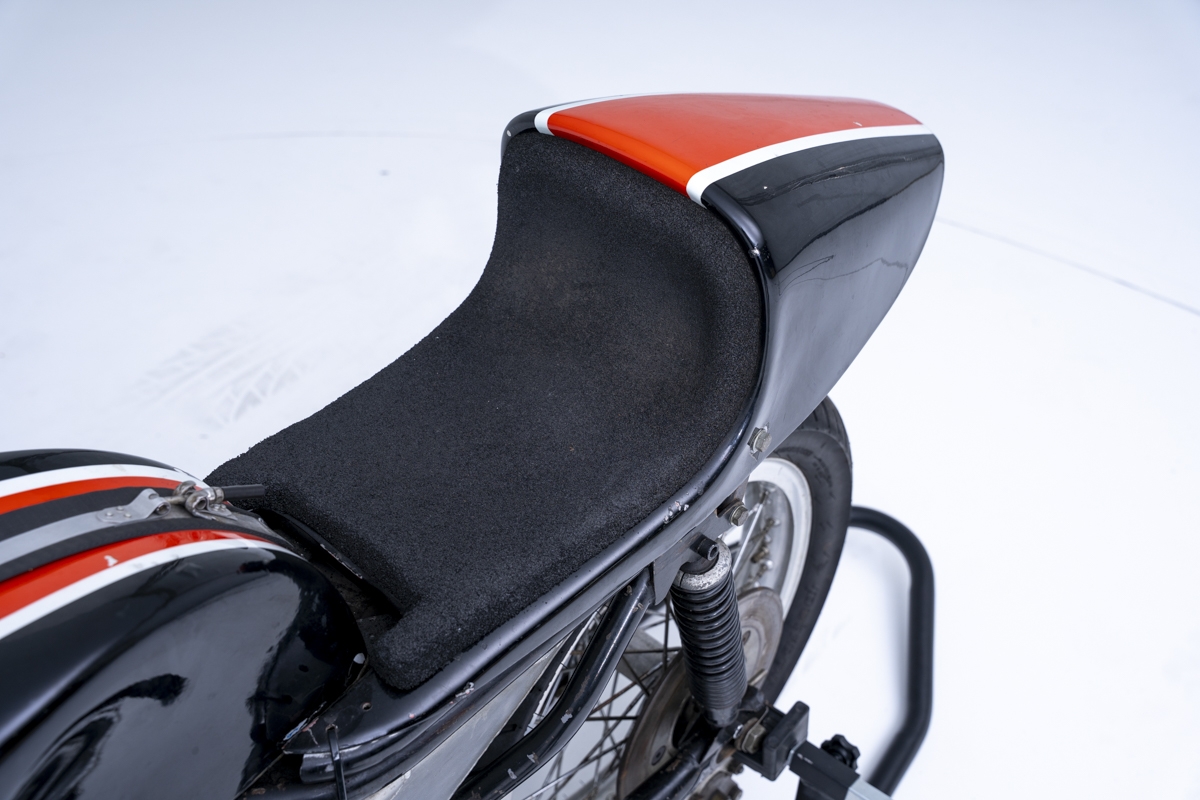グリップテープ張りのレーシングシートや、タンク上部のレザークッションを備えたその姿は、KRシリーズの最終進化版であり、1968-1969年のデイトナ200を制した“Low-Boy”フレームモデル然とした佇まいを纏っている。