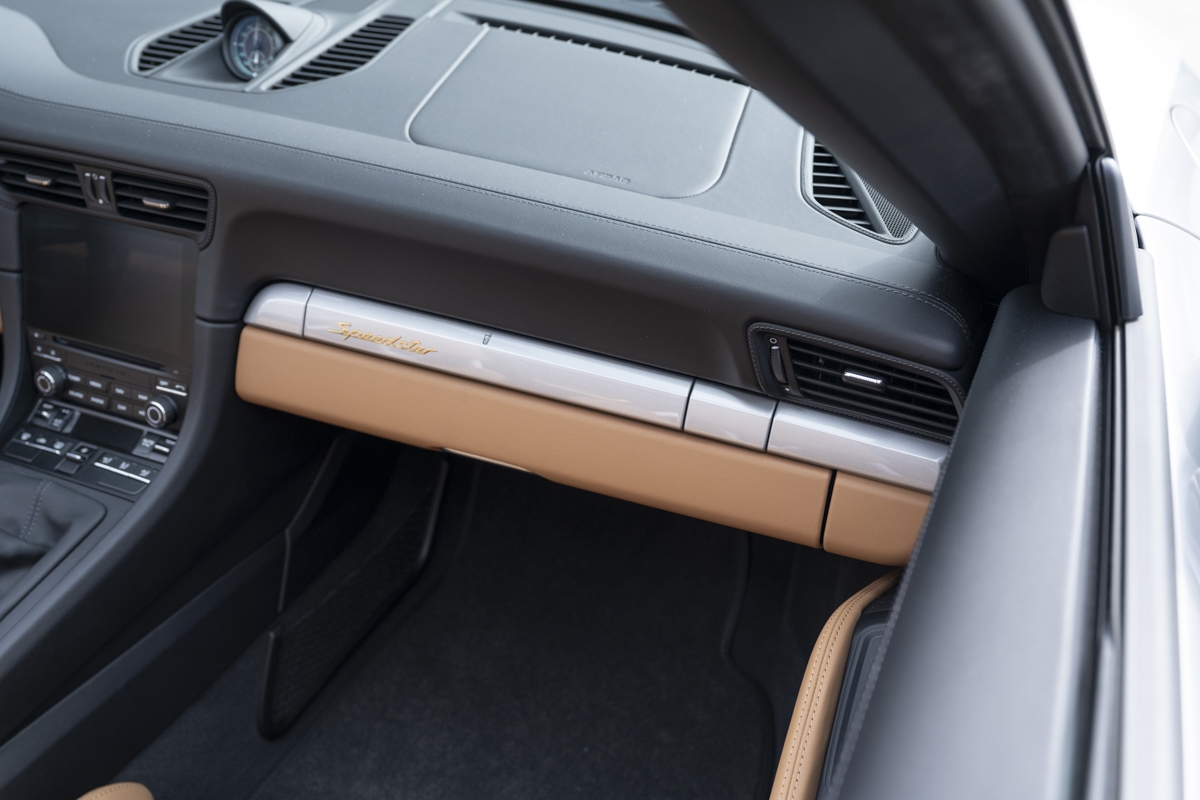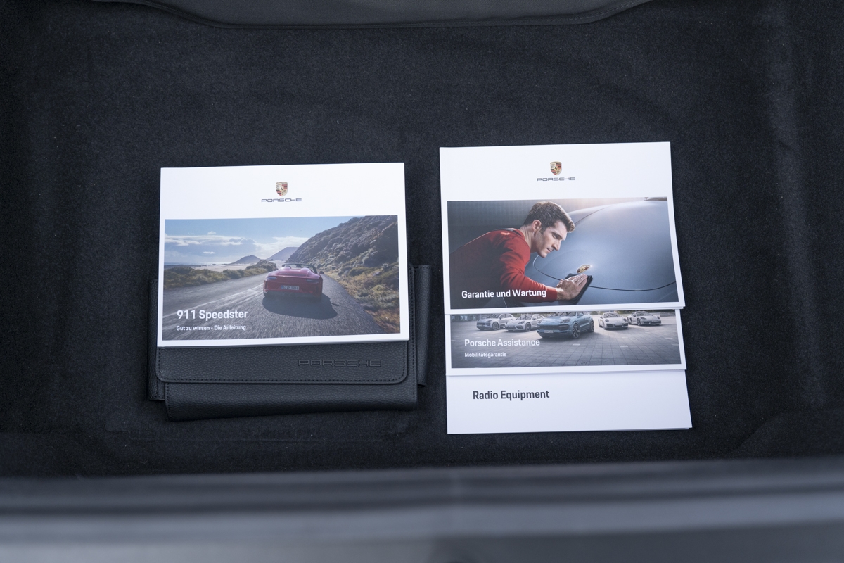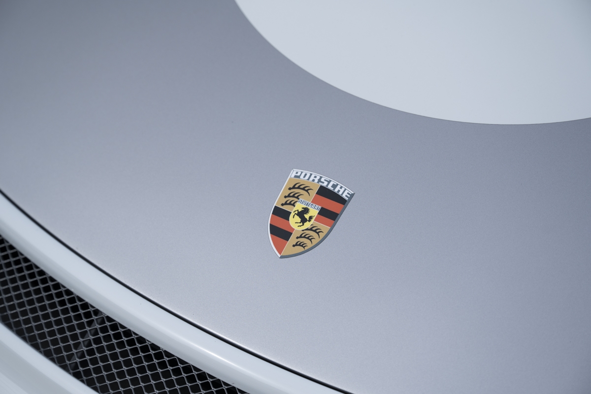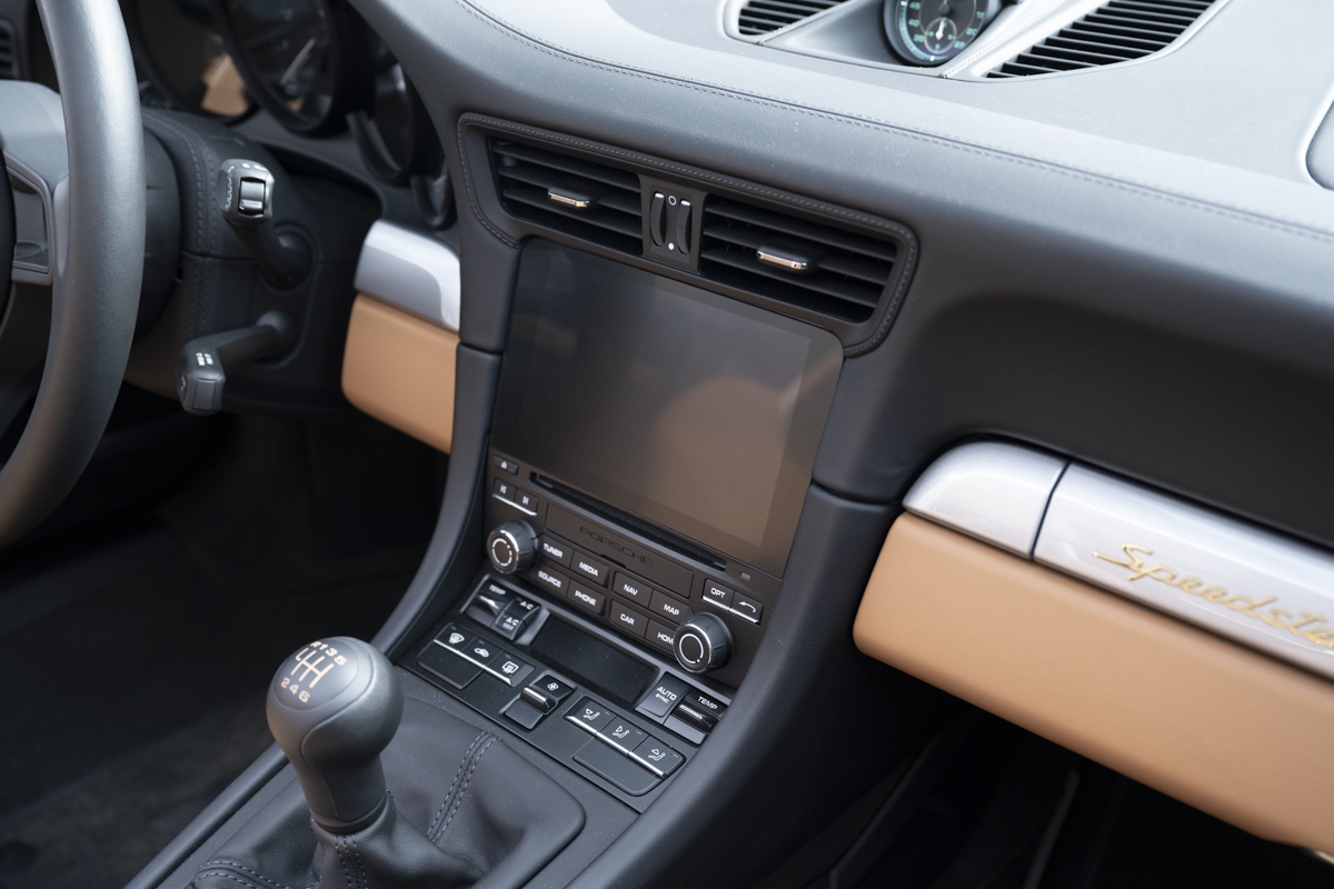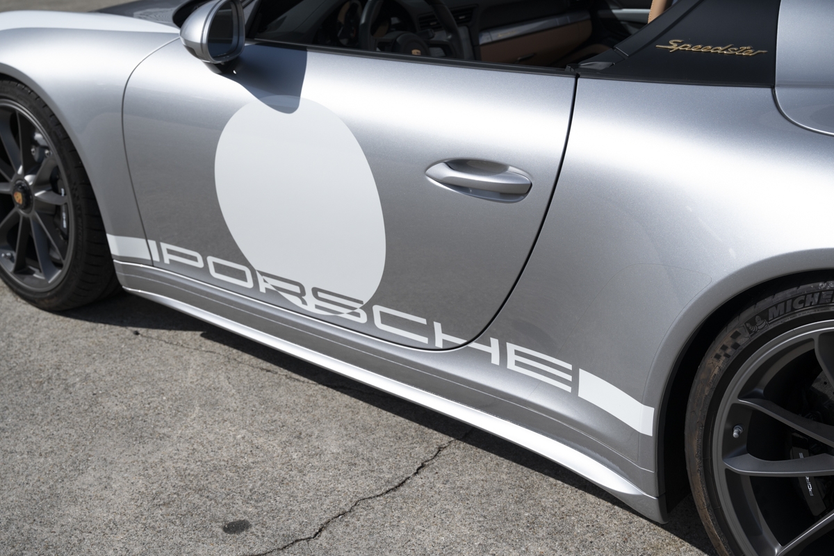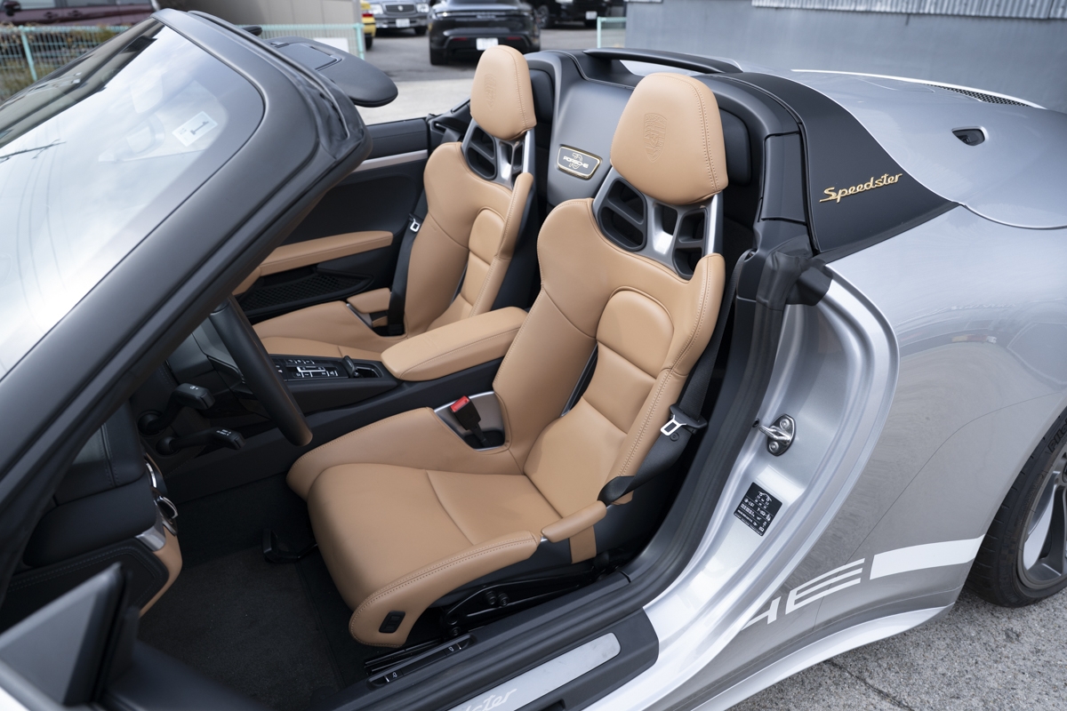 This example is specified with Porsche’s first Heritage Design Package. Finished in GT Silver Metallic, it features white-painted front detailing, wide B-pillars, and gold-plated “Speedster” script at the rear. Notably, the Heritage Design Package was available only through direct factory order in Germany.