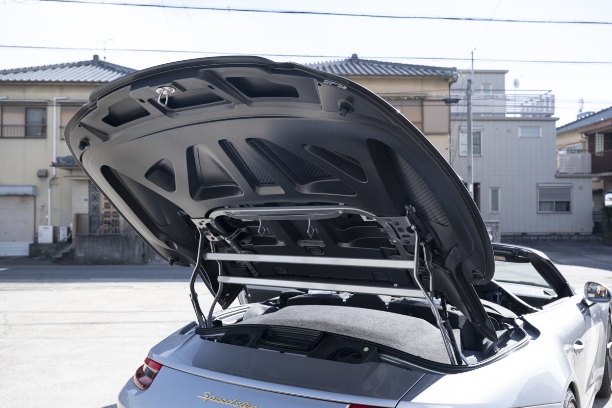 Externally, the car features the distinctive double-bubble rear tonneau cover, a shortened windshield frame, lightweight side window glass, and a manually operated fabric roof. This roof mechanism is identical to that of the 911 Speedster Concept unveiled at the Goodwood Festival of Speed, recalling the spirit of the 356 Speedster.
